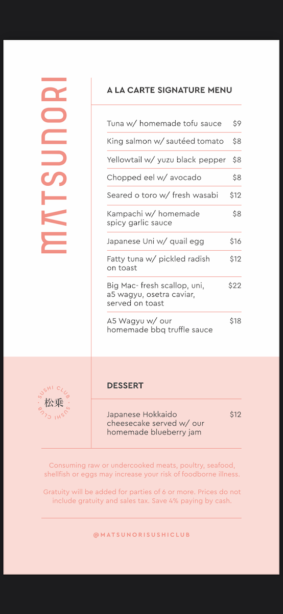 For those seeking adventure, the Big Mac is a standout for $22, merging culinary creativity with traditional sushi elements. Highlighting the spirit of fusion, the Kampachi W/ Homemade and Chopped Eel W/ Avocado showcase Matsunori's dedication to flavor and presentation. Don’t forget to leave room for dessert; the Japanese Hokkaido Cheesecake at $12 is the perfect sweet ending to a culinary adventure.